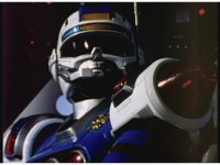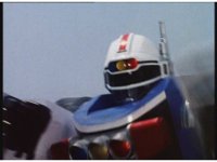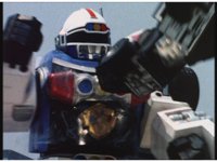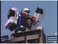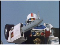 Inside the tunnel, Robo Racer continues driving. jacketed Blue Senturion talks and shifts gear, causing his Zord to shift around, transforming out of patrol car mode. Upon exiting the tunnel, Robo Racer lifts off the road, and finishes transforming into robotic Zord mode in a flash of blue energy, saluting before his giant badge symbol. |