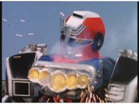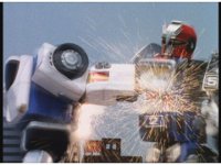 Jacketed Robo Racer whips out its wrist gauntlet blades, and sparkily slashes Turbo Megazord repeatedly. |