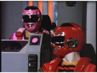 Slow zoom in on cockpit, as the Rangers watch, Pink talking to Red. |