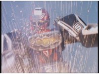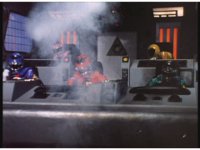 The Turbo Megazord cockpit spark and smoke bursts. |