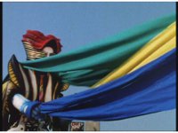 Pull away, upward angle, as Turbo Megazord & Robo Racer lower their weapons triumphantly. |