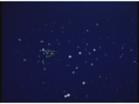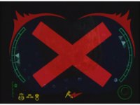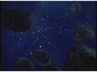 Dreadfeather passes through an asteroid belt, checking it out with his binoculars, which scan the asteroids, giving a big red X for each one. |