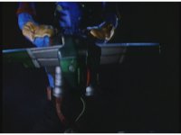 Storm Blaster is pulled through the air, past Elgar & Dreadfeather, smashing through the skylight, and as Red looks back to watch, is pulled through the sky by Lightning Cruiser. |