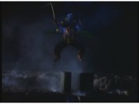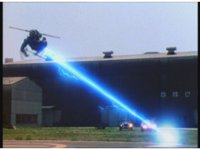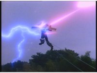 His leg hooked in place, Dreadfeather is trapped in midair as he's bombarded with red beams, causing him to crackle with electricity before exploding massively. |