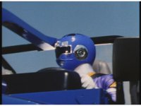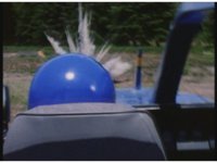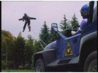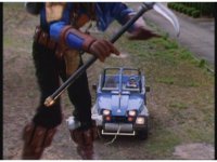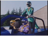 Pan up along Storm Blaster as it drives forth, Blue in driver's seat, Yellow in passenger's, and Green standing in the back. |