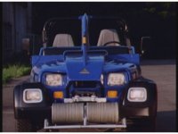 Blue walks alongside Storm Blaster, talking to his teammates as he puts both hands on it briefly, before the jeep flashes headlights. |