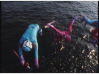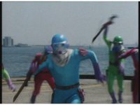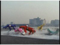 Chromites leap out of the water and over the camera, the Rangers rushing into battle with them. |