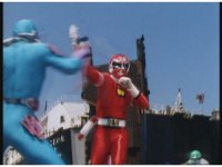 Turbine Laser flies in, Red gestures, it lowers its wings into a stand, extends its cannon, lowers to the Rangers, who grip it, as its turbine spins with energy. The Rangers spread arms out as the Turbine Laser fires a spinning ball of flaming red energy forth. |