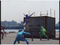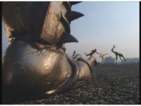 The Rangers regroup facing Havoc, who gestures his crop upward, they look up, and see Metalasaurus stomping down upon them, they dive out of the way in the nick of time, and look upward as they recover. |