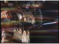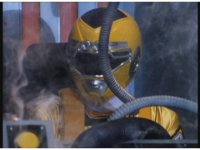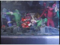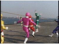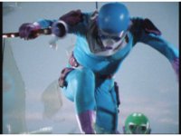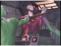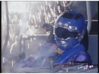 The Chromites climb up to the Turbo Megazord window, smash their way in, and ambush the Rangers, they fight back, Blue first up in a close-up. |