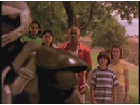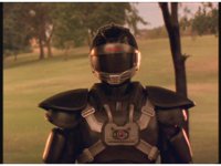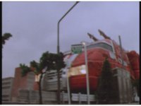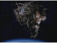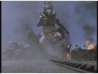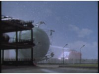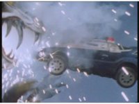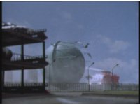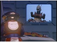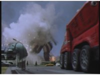 Havoc is jolted in his cockpit, then has Metalasaurus whip its tail over, sending one of those big gas containing domes rolling forth across the city. Red pulls up in Lightning Fire Tamer, sprays water at it, sending the ball full of explosives rolling back at the evil Zord. Havoc speaks a little, before it ignites, sending Metalasaurus shooting straight into the sky, exiting our atmosphere and slamming explosively into the Space Base. |