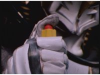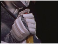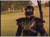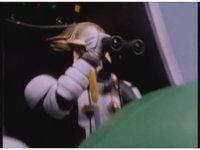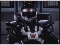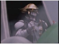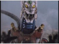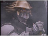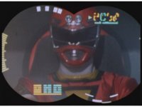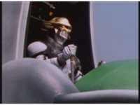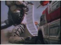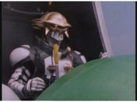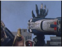 Havoc scopes out Lightning Fire Tamer and its Red Ranger pilot via some special binoculars, talks a little, then presses a control stick button, firing Metalasaurus' eyebeams at the ground below, causing Red to back up his Rescuezord and retreat. |
