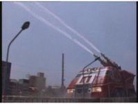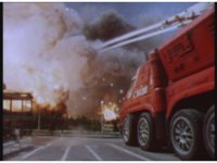 Red drives along in Lightning Fire Tamer, then presses a button, shooting water cannons at Metalasaurus, overwhelming Havoc's control, until it backs away from the skyscraper. |