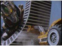Green drives Thunder Loader toward the evil Zord, dumps the payload of giant metal balls, and crosses Metalasaurus' path as it chases Siren Blaster, leading to it slipping and falling on its tail. |