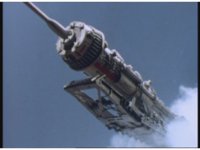 Turbine Laser lowers its wings into a stand, extends its cannon, lowers to the Rangers, who grip it, as its turbine spins with energy. The Rangers spread arms out as the Turbine Laser fires a spinning ball of flaming red energy forth. |