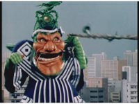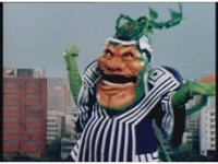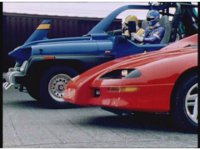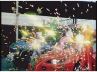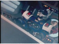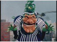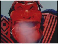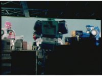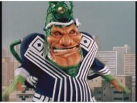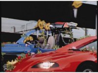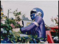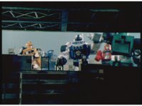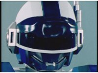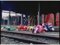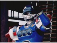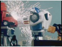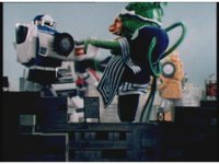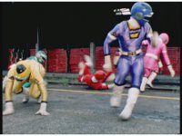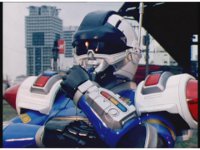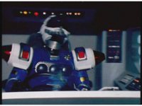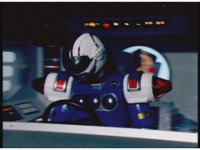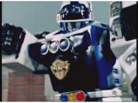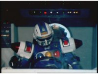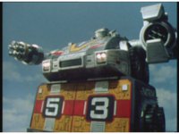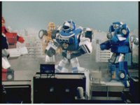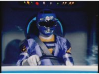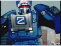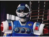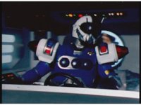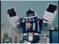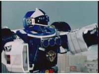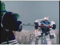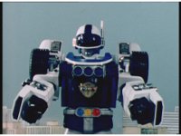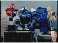 The Rangers react to evil Robo Racer, inside, evil Blue Senturion addresses them, then tries to stomp them with his Zord, but misses. |