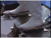 Close-up of Green's feet strapped into Storm Blaster. |