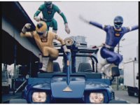 Ranger-colored explosions erupt in the flat desert. |