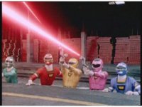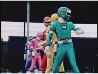 In Rescue Megazord cockpit, the Rangers cross arms, then punch both fists forth. |