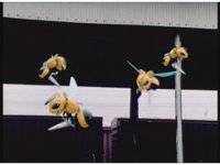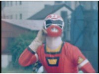 Robo Racer staggers, head spinning, turning around to a nearby building as HS Star Racer & Wind Rescue approach. |