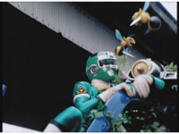 Wild Weeder & Bee Drone rush into battle, the monster fighting Robo Racer, while the Drone fights the HS Rescuezords. |