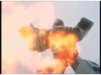 Wild Weeder turns his back to Rescue Megazord, falls, and explodes massively, the Megazord lowering Artillery Cannons in triumph as the smoke clears. |