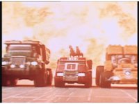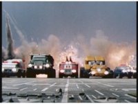 The five Rescuezords drive forth as explosions erupt behind them. |