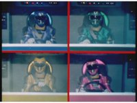 Four square shot of Justin & Carlos, and Ashley & Cassie morphing into Turbo Rangers. |