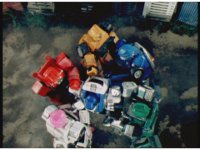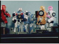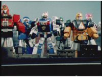Each of the HS Rescuezords & Robo Racer put their fists together, then break off and pose. |
