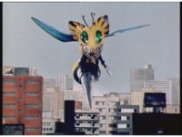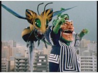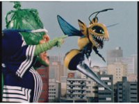 The Rangers fall down, as evil Blue Senturion walks casually onto the scene. The Rangers turn attention to him, he signals to Wild Weeder, and the monster sits down while his Bee Drone flutters about. |