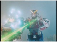 Rescue Megazord comes over to Robo Racer's side, whips out its hand-held blasters & fires upon Wild Weeder, blasting him away, before ripping off the vines and casting them aside. |