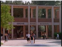 Angel Grove High School front entryway, students walking about, one standing, car traffic visible. |