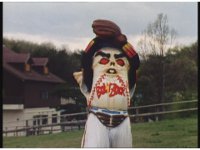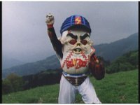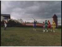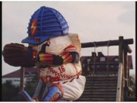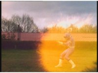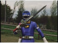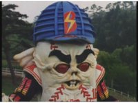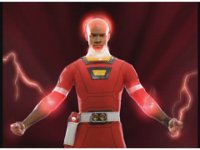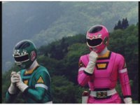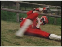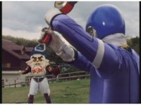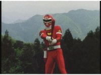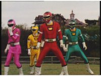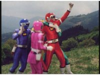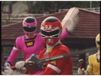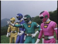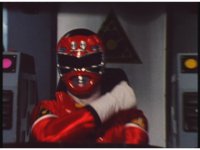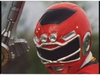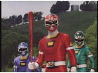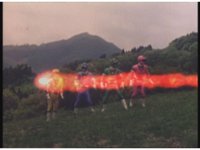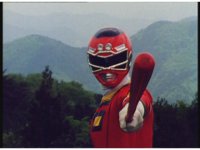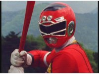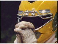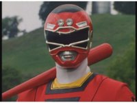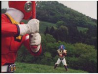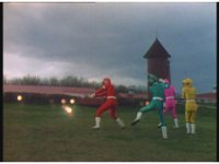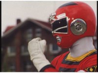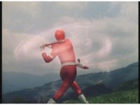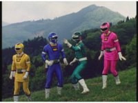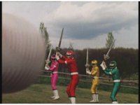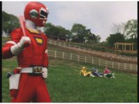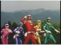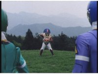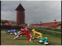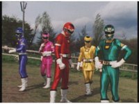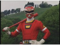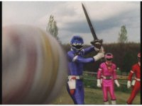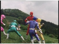 Strikeout is out standing in a field, talking to himself, when the other four Rangers appear, the guys talking back to him, prompting him to respond. |