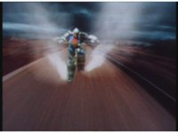 On one foot, leaning forth, Turbo Megazord speeds directly at us down a vast, endless dirt road. |