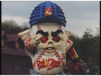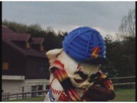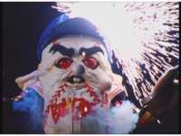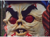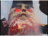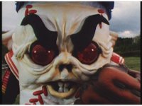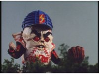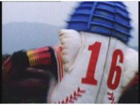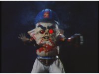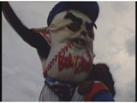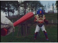Close-up on Strikeout as he talks, wagging eyebrows, then holding up his sunglasses-wearing baseball. |