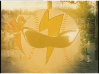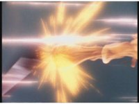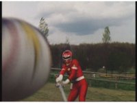First up to bat using a Turbo Blade is Blue. He talks and gestures, then readies to hit the ball. Strikeout throws it, and the curve ball drops right before Blue can hit it, a superimposed explosion erupting him down. |