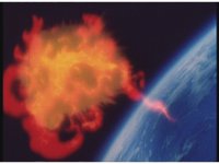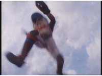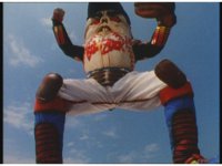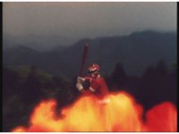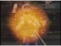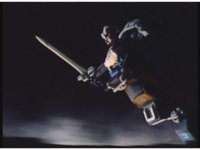Upward track around and push in on Turbo Megazord, lowering sword triumphantly beneath the blue sky. |