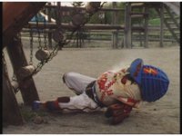 Strikeout pitches another ball, but this time, Red spots the trick, and successfully hits it back to the monster explosively, knocking him into the playground. |