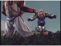 Strikeout talks and motions arms about, ready to pitch, while Turbo Megazord is battle ready. |