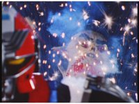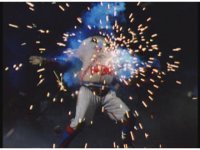 As Turbo Megazord remains with its back to the monster while partially in frame, Strikeout violently spark bursts behind it. |