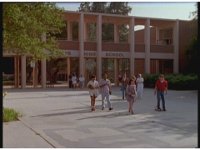 Really distant exterior front entry gateway path of Angel Grove High School. Couple walks out, guy bouncing basketball also. |