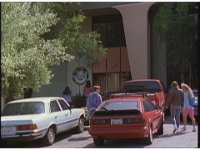 Exterior of Youth Center, as woman in pink and girl in blue head inside, guy from red car heads that way, glancing over at two girls approaching from our right. |