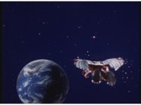 The Divazord puts its feet together and lift-offs from the lunar surface, flying toward Earth. |