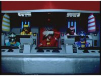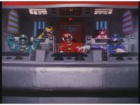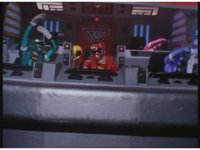 In the Rescue Megazord cockpit, the five Rangers glance about and react. |