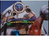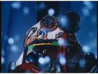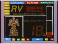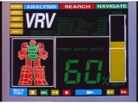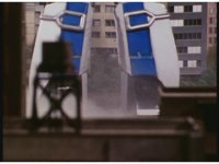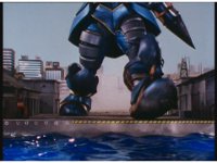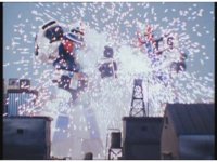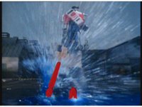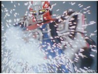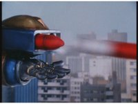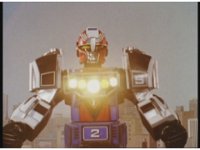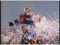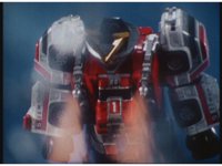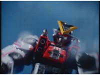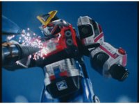 Zoom out, as Turbo Megazord's chest headlights come on, a quick motioning of the arms and the headlights fire a reddish beam with blue electricity forth. |