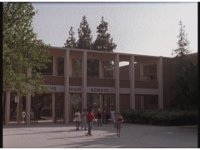 Exterior of Angel Grove High School, students heading away from school, skateboarder approaching girl, couple walking, basketballer also. |