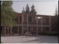 Exterior of Angel Grove High School, couple walking, basketballer nearby. |
