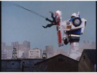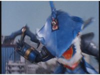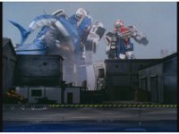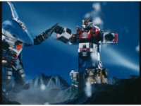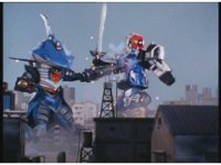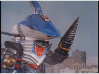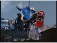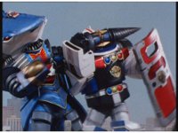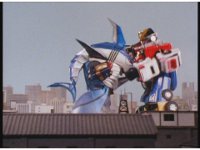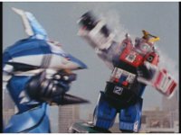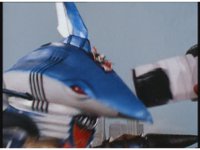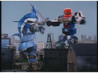 Sharkzord marches over to Rescue Megazord and headbutts into it, only to get punched away. |