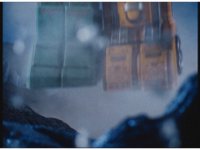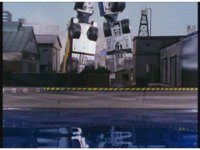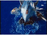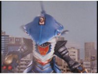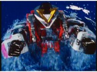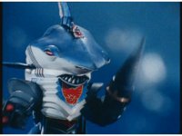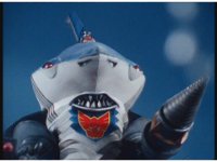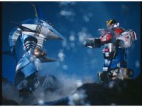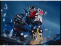 Sharkzord surfaces from the sea via reverse photography, prompting Rescue Megazord to react. |
