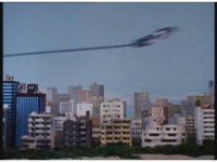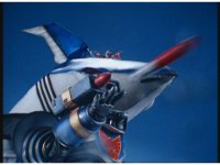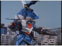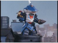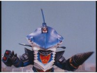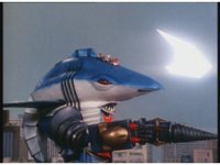 Porto clenches his fist, then shifts gear, causing Sharkzord to fire its fin in energy form at Rescue Megazord, circling around it before sparkily striking its back. |